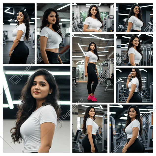 Explore this AI-generated photo set featuring an Indian girl in white T-shirt at gym. Perfect for fitness, lifestyle, and wellness projects. High-resolution, realistic images ideal for social media, ads, and design work.